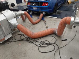 The best way to protect mechanics and garage employees from the potentially harmful gases released from vehicles running on the dyno is to capture it at the source: directly at the tailpipe. This process involves the capture of the fumes through suction hose, nozzles, hose mechanisms and fans. The most base system uses a hose reel, as reels are proven space saving devices and go along way in protecting the hose from abuse over time. This solution is delivered with the appropriate hoses to suit the application and can be further enhanced through the addition of optional tail-pipe adapters, extension booms & fans.
